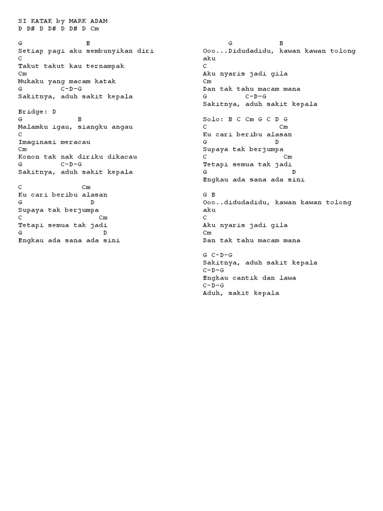 D D D D D D D Cm G B Setiap pagi aku sembunyikan diri C Takut takut kau ternampak Cm Mukaku yang macam katak G C-D-G Sakitnya aduh sakit. D D D D D D D Cm G B Setiap pagi aku sembunyikan diri. Kumpulan Chord Gitar Dan Lirik Lagu Terlengkap.